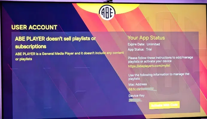 L’activation de l’application ABE PLAYER est prise en charge par notre équipe IPTV Maroc Pro. Il vous suffit de communiquer l’adresse MAC de votre application avec nous. Si vous souhaitez procéder vous-même, voici les étapes à suivre :