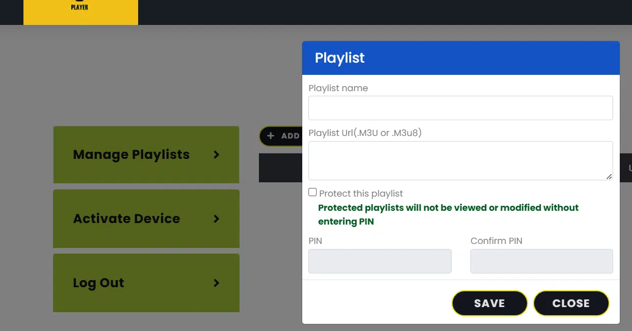 - Saisissez les identifiants de connexion l’URL M3U de la playlist que vous avez reçue par e-mail. Ensuite, cliquez sur Save pour finaliser l’opération.